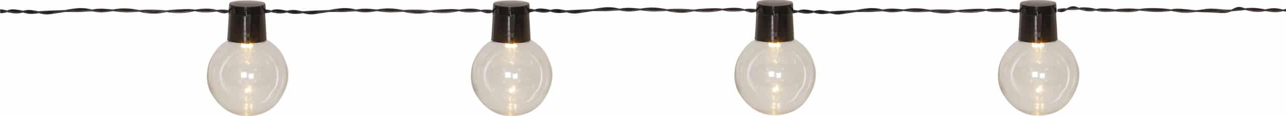Partyljusslinga för utomhusbruk med 16 klara höljen och svart kabel. Häng upp ljusslingan som en dekorativ och stämningsfull inredning. Ger ett vackert och mysigt sken i mörkret. 32 varmvita LED fördelade på 16 klara höljen.