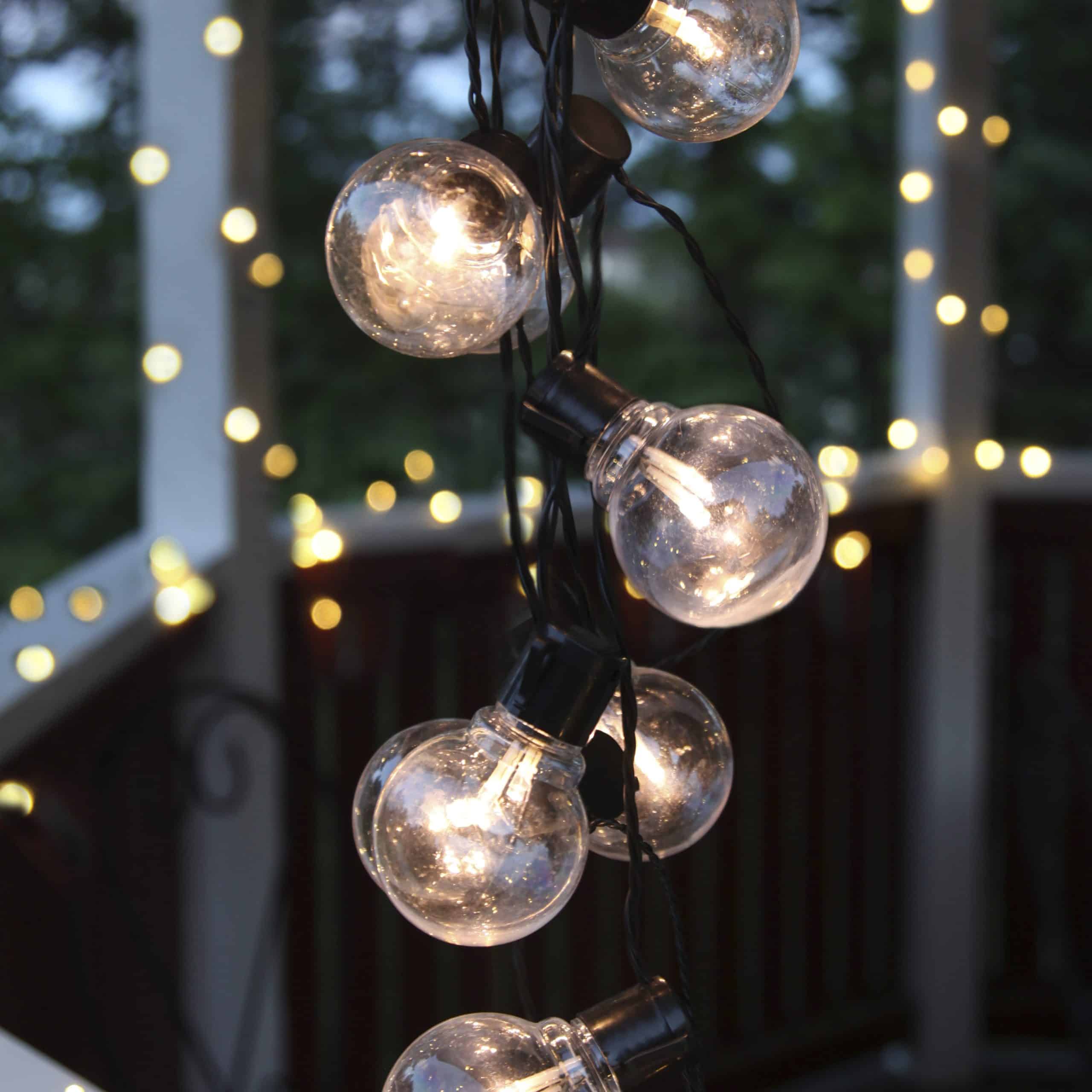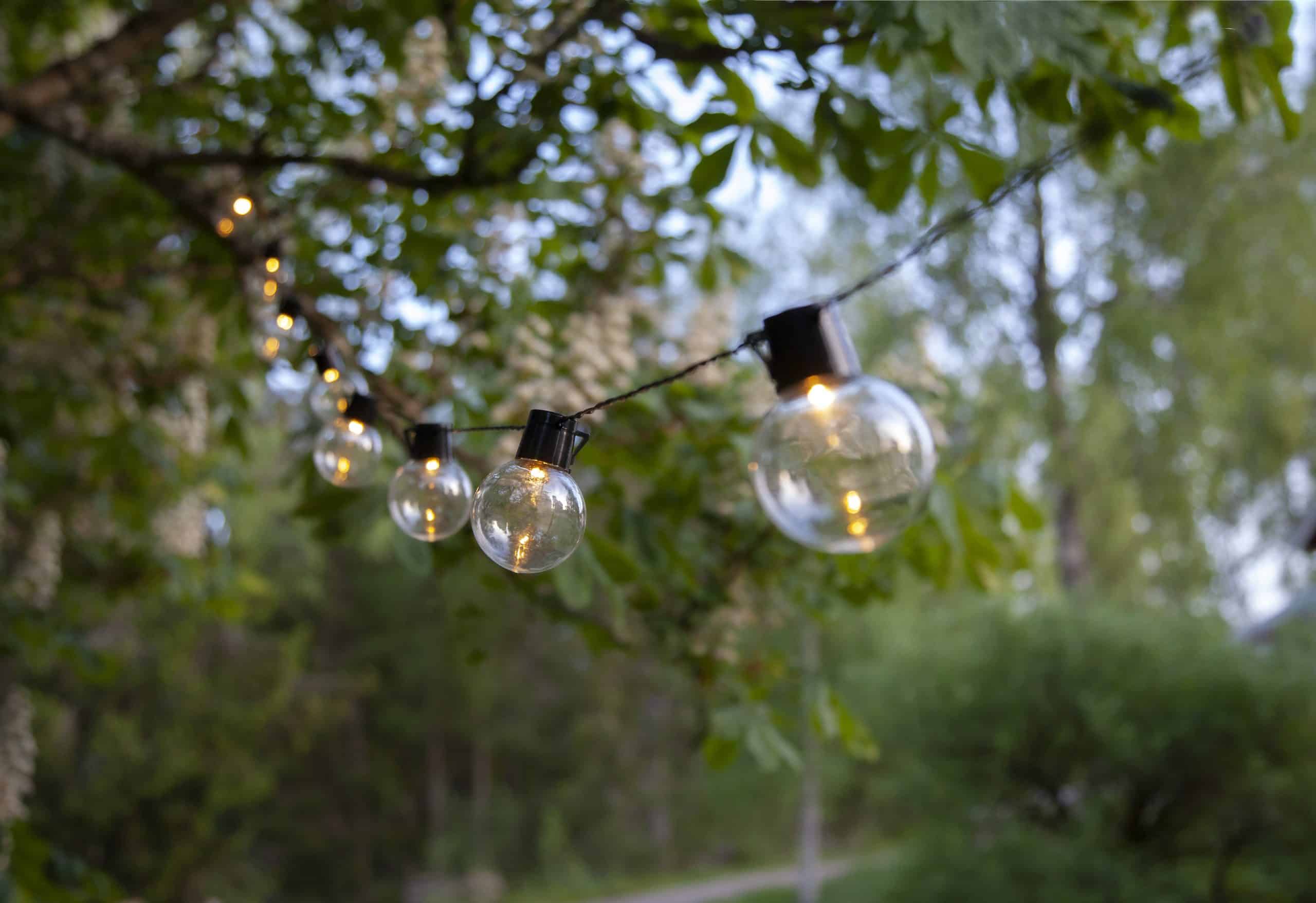 Partyljusslinga för utomhusbruk med 16 klara höljen och svart kabel